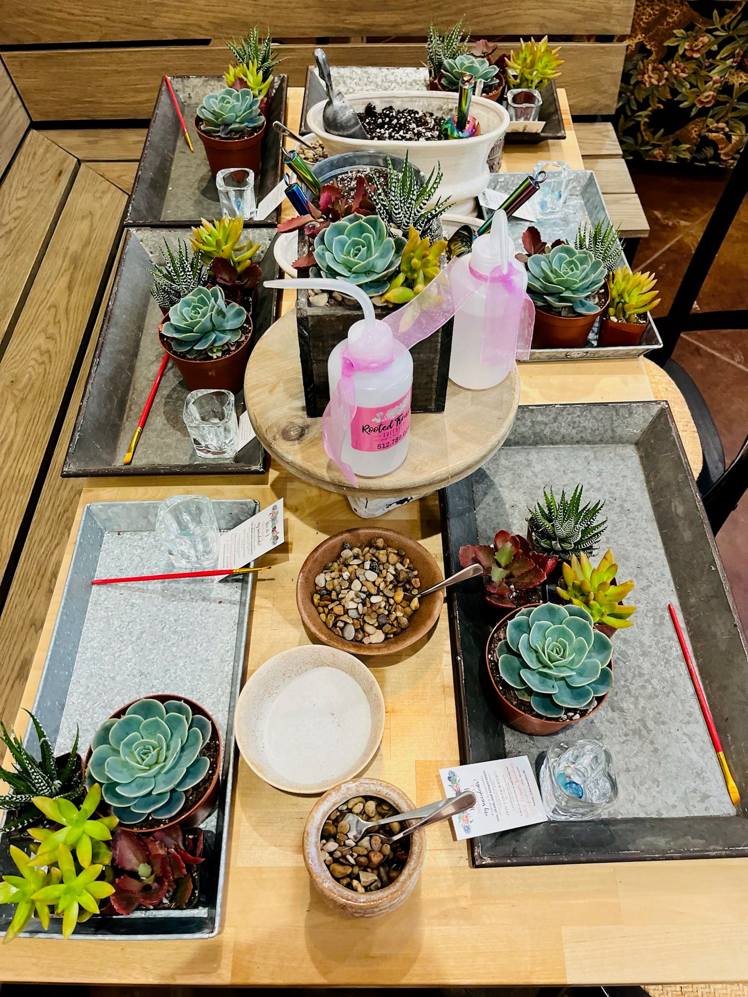 Rooted Treasures Succulents supplies all the necessary elements for your event at our home studio so your guests can create their own succulent arrangements and receive succulent care tips.