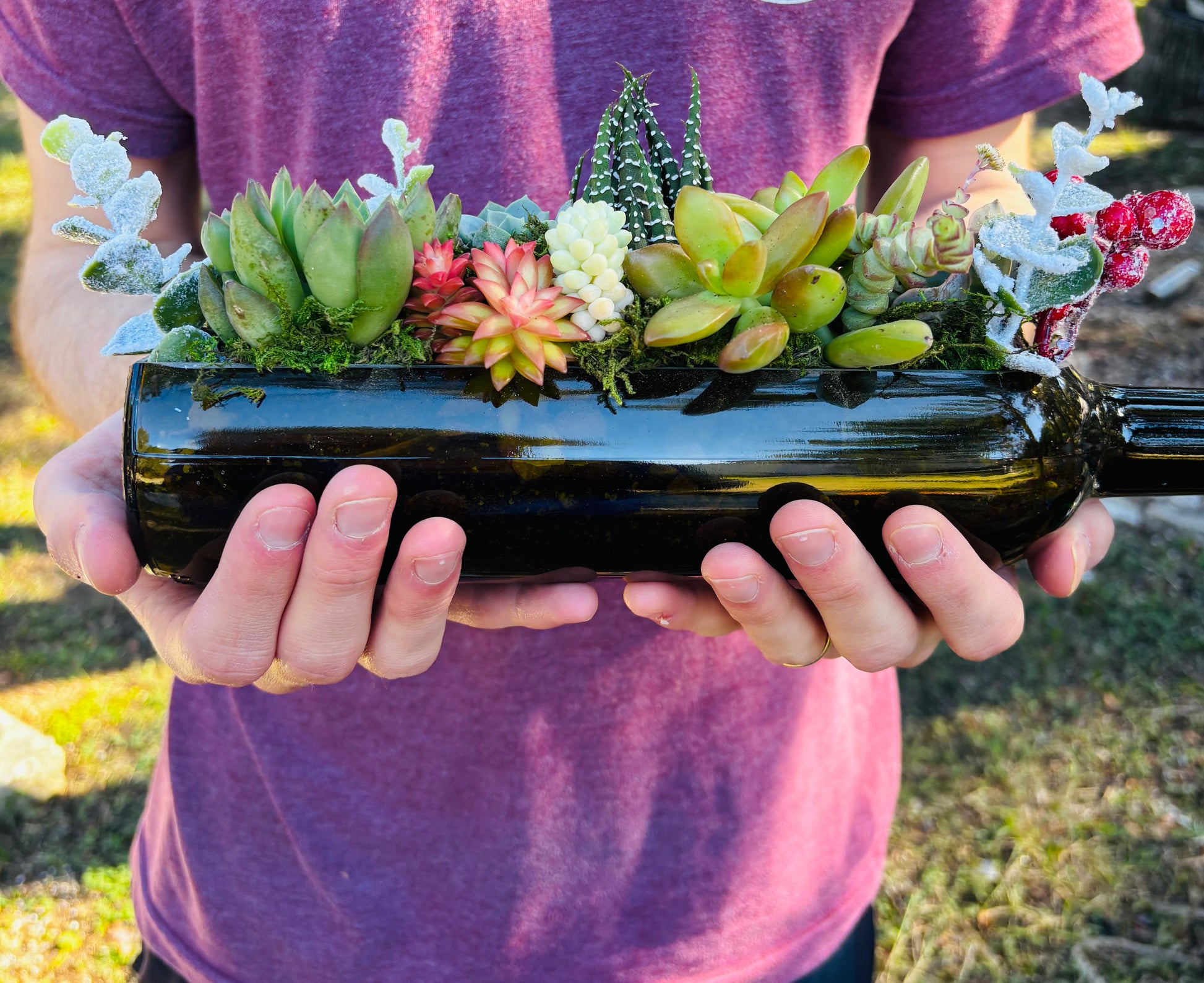 Design your own wine bottle succulent planter, complete with a metal stand β the perfect blend of cozy and chic for holiday dΓ©cor. Includes premium succulents, soil, and festive dΓ©cor accents.