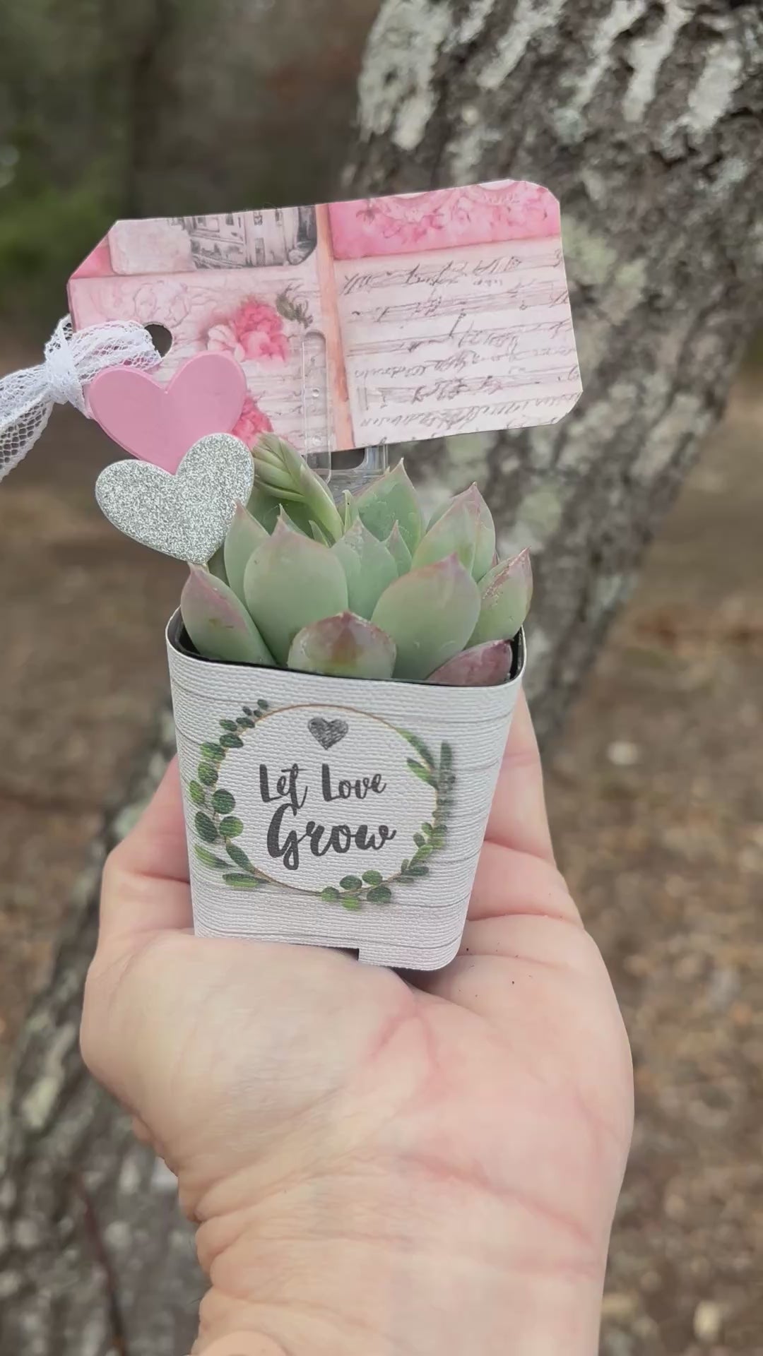 This "Let Love Grow" is a gorgeous 2 inch succulent wrapped in an adorable white shiplap vinyl wrap. Includes a handmade tag and heart pick.