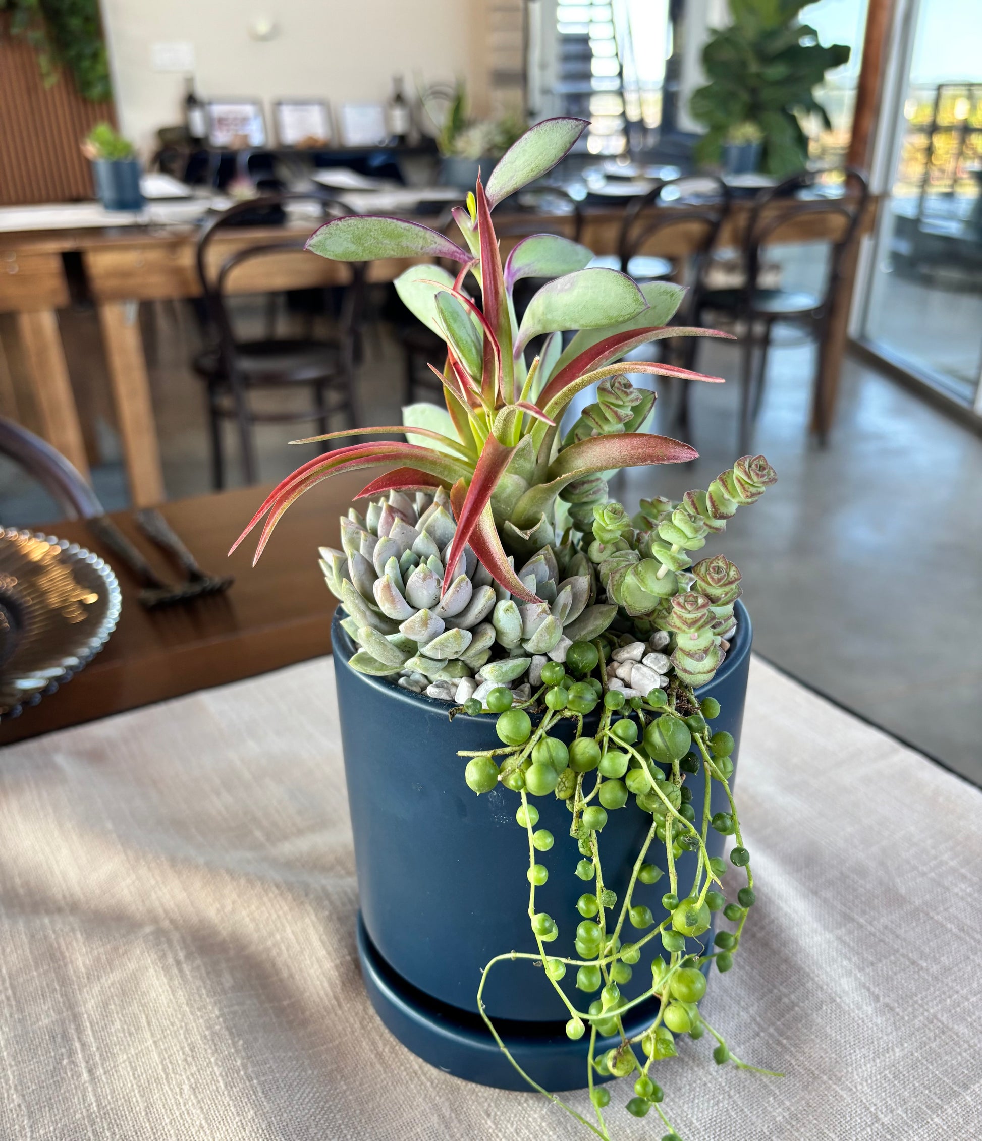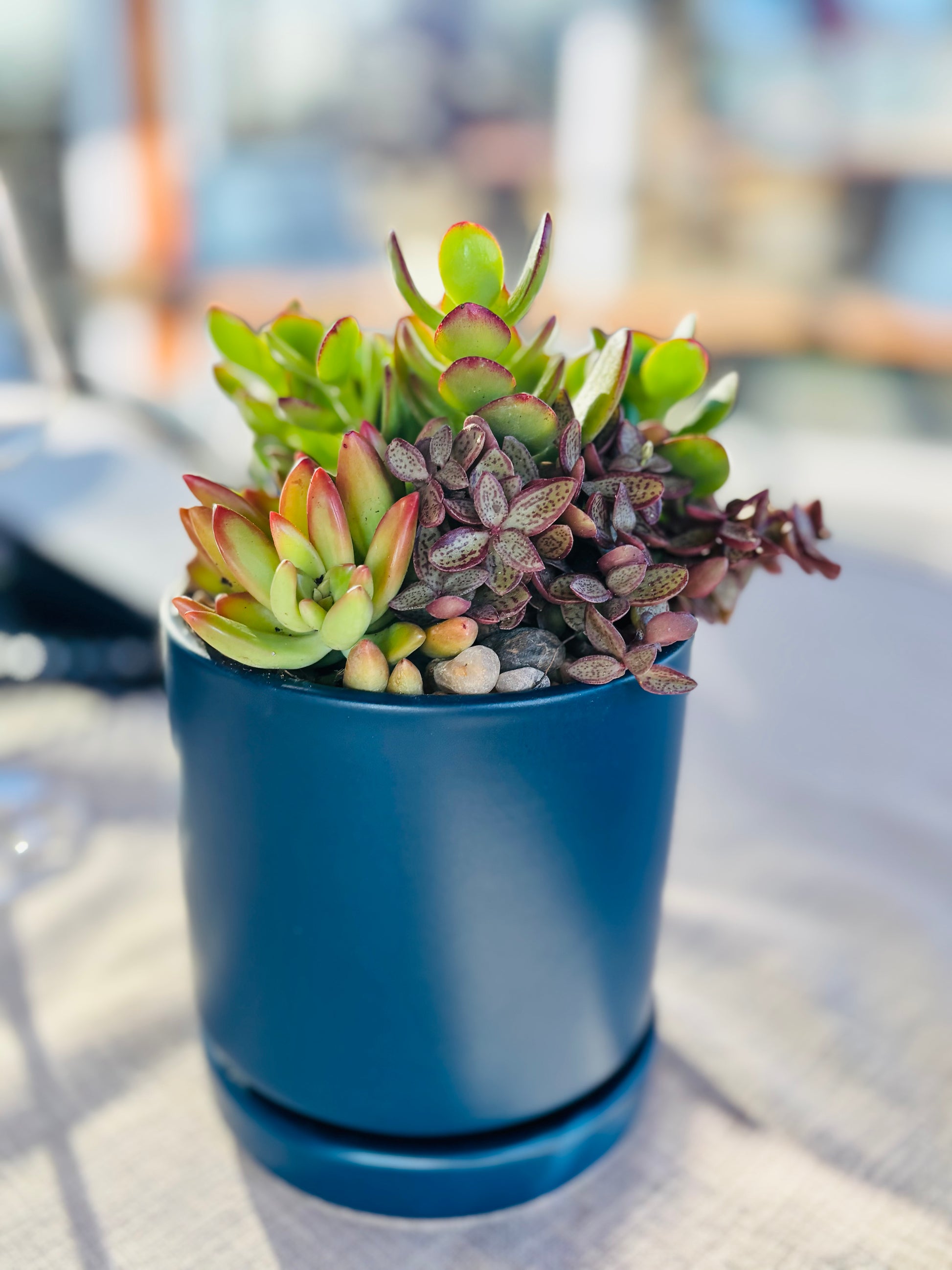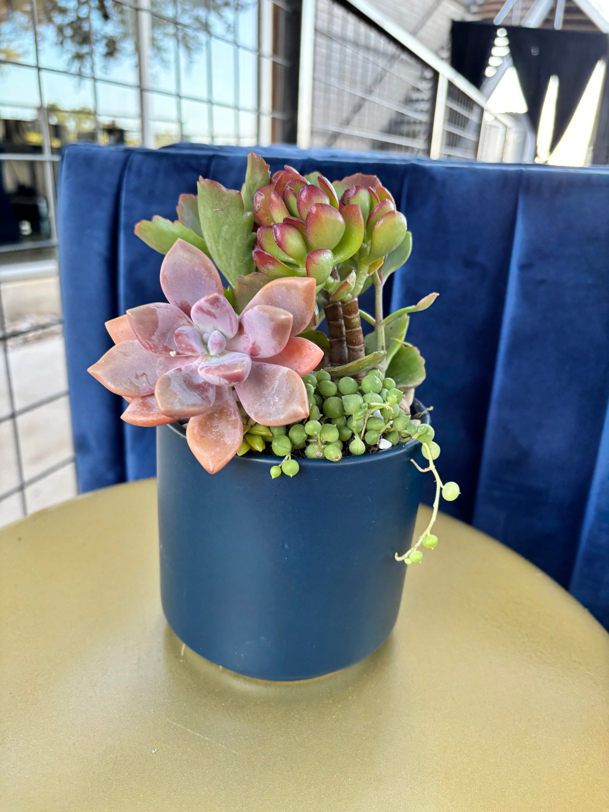 Meet your new favorite mini garden — a stunning indigo blue gemstone pot, handcrafted by a talented woman-owned pottery studio, and filled to the brim with personality. Inside you’ll find a curated mix of succulents, cacti, and/or air plants arranged to perfection… and ready to brighten up any desk, windowsill, or gift bag.