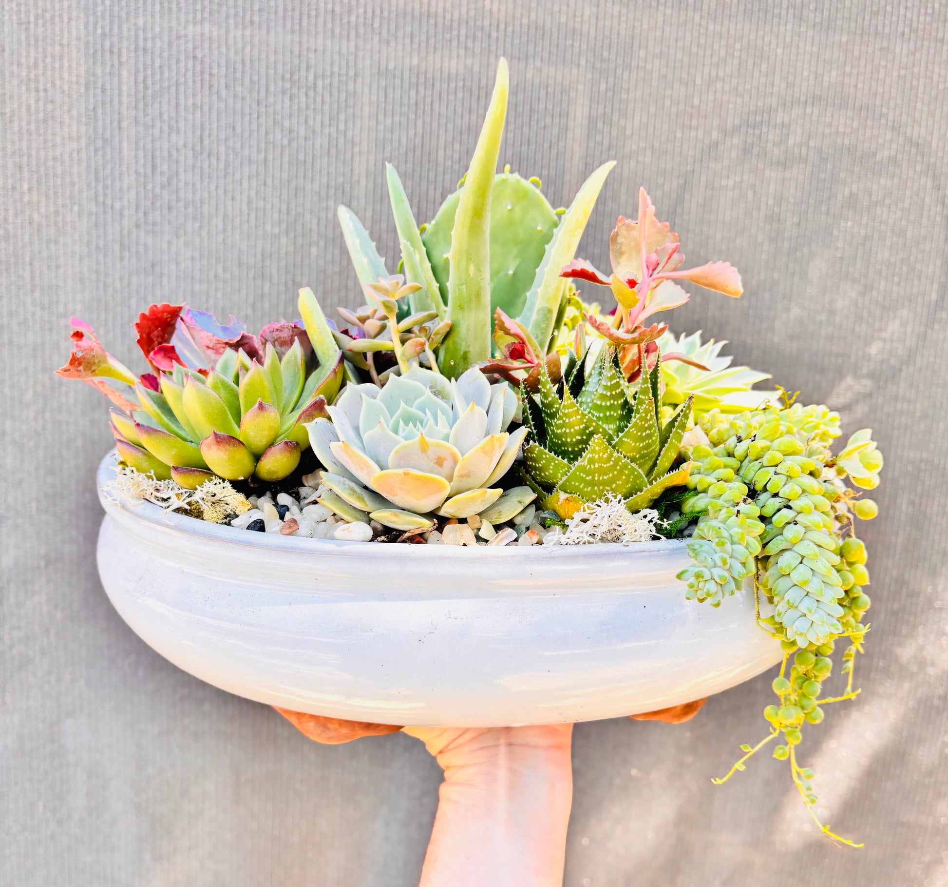 This low bowl white ceramic planter is full of healthy, colorful succulents.